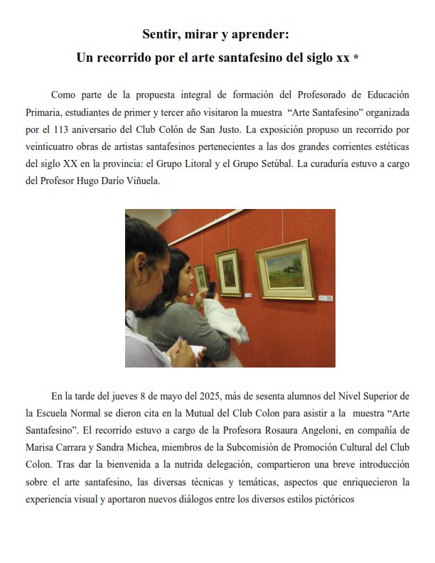 Sentir, mirar y aprender: «Un recorrido por el arte santafesino del siglo XX» Con mucha satisfacción compartimos esta publicación, elaborada a partir de producciones realizadas por las estudiantes de 1.º Año “C” del Profesorado de Educación Primaria, en el espacio curricular Comunicación y Expresión Oral y Escrita, de la Escuela Normal Superior N.º 31 “República de México” (San Justo). Este trabajo refleja su compromiso, creatividad y aprendizaje en formación docente.